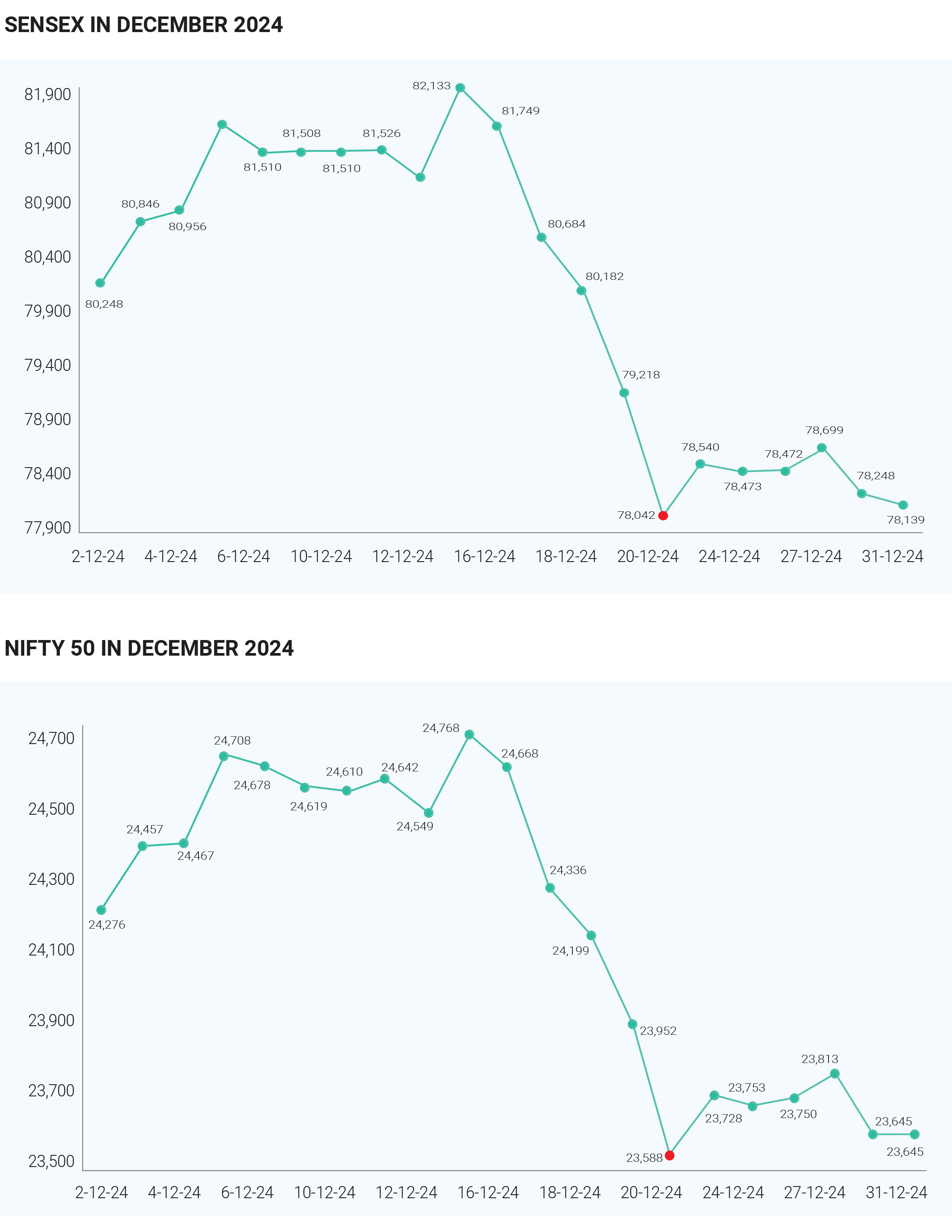 This potential boost in exports was seen positively by investors, contributing to a more favourable outlook for certain sectors within the Indian market. Despite these opportunities, the overall sentiment in the Indian stock market remained cautious due to the broader implications of U.S.-China tensions on global economic stability. The uncertainty surrounding trade policies led to volatility in the markets, with both Sensex and Nifty experiencing fluctuations as investors reacted to news related to tariffs and trade negotiations. Sector performance in December showed mixed results. Sectors like metals, pharmaceuticals, IT, and real estate demonstrated resilience, while FMCG struggled due to weak growth projections from companies such as Godrej Consumer Products. Although the festive season typically boosts consumer spending, broader economic challenges tempered performance. Mid-cap stocks outperformed large-caps, with the BSE MidCap index showing positive returns, driven by stronger domestic institutional investments and a favourable outlook for smaller companies. Similarly, small-cap stocks performed well, with the BSE SmallCap index recording significant gains throughout the year. This segment benefited from niche market opportunities and growing consumer demand, attracting retail investors seeking higher growth potential amidst volatility in large-cap stocks. In December 2024, Foreign Institutional Investors (FIIs) played a significant role in the Indian stock markets, reversing a trend of heavy selling from previous months. The first two weeks of December saw FIIs make net investments ranging from ₹22,766 crore to ₹24,454 crore, signalling renewed interest in Indian equities. This shift was driven by attractive valuations and growing expectations of rate cuts by the U.S. Federal Reserve. The influx of foreign capital helped fuel a rally in large-cap stocks, particularly in sectors like banking and IT. FIIs’ positive sentiment was a crucial factor supporting overall market performance. However, despite the strong inflows, FIIs remained cautious. On certain days, they were large sellers, indicating that at elevated price levels, they might revert to selling due to concerns over high valuations in India relative to other markets, as well as the potential impact of a rising dollar. The renewed interest from FIIs particularly benefited sectors that had previously faced pressure, with the banking sector seeing increased investments. Investors viewed the sector as reasonably valued and poised for growth, supported by rising domestic institutional and retail investments. Overall, the FII inflows in December 2024 provided a much-needed boost to the Indian equity market. Overall, December 2024 was marked by significant volatility driven by external economic factors, geopolitical tensions, and domestic economic indicators, leading to a challenging environment for both Sensex and Nifty indices.