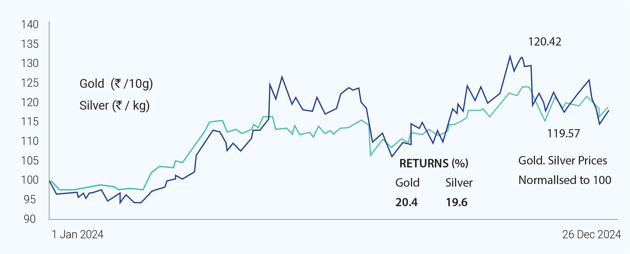 prices was the anticipation of a 25-basis-point interest rate cut by the U.S. Federal Reserve. Lower interest rates typically boost the appeal of non-yielding assets such as gold and silver, prompting investor interest in these precious metals. Geopolitical developments, including tensions surrounding North Korea and Russia, provided further support to gold prices as investors flocked to safe-haven assets. In addition, China’s central bank resumed gold purchases after a six-month pause, signalling robust demand from central banks, which plays a significant role in driving global gold prices. December is a month marked by increased demand for gold in India, driven by the wedding season and festivals. Retailers typically stock up on inventory to meet consumer needs, creating upward pressure on prices. Additionally, inflation concerns played a role, as higher inflation generally leads to greater demand for gold as a hedge against rising prices. Fluctuations in inflation data affected market sentiment and expectations regarding future monetary policy decisions. The performance of the U.S. dollar also had an impact, as a stronger dollar can make gold more expensive for holders of other currencies, potentially reducing demand. India’s gold imports followed a cyclical trend, with a significant drop in December 2024 after record-high imports in November. Early in December, gold prices remained relatively stable, with 24K gold priced at ₹78,030 per 10 grams on December 18. However, geopolitical concerns and market volatility led to fluctuations in the latter part of the month. By December 27, gold prices increased for three consecutive days, reaching ₹77,890 per 10 grams in Delhi, supported by heightened tensions in the Middle East that drove investors to seek safety in gold. As December drew to a close, gold prices saw a slight decline, falling to ₹78,003 per 10 grams in Delhi on December 30, amid lower trading volumes due to the holiday season. On December 31, gold prices further dipped to ₹75,500 per 10 grams in Mumbai and ₹75,710 in Delhi, reflecting a ₹420 decrease from the previous day. This downward trend was primarily driven by profit-taking among investors and market adjustments due to broader global conditions. Silver prices mirrored gold’s performance, starting strong but facing fluctuations throughout the month. On December 18, silver was priced at ₹92,500 per kg. By December 27, silver saw a modest increase to ₹91,700 per kg, driven by firm global trends and some industrial demand. However, by December 31, silver prices dropped to ₹87,310 per kg in Delhi, following a broader decline across precious metals as traders adjusted their positions toward the year’s end. To summarise, gold and silver prices in December 2024 initially rose due to safe-haven demand fuelled by geopolitical tensions, but ultimately faced declines by month-end due to profit-taking and the seasonal slowdown in trading activity. The bullion market in India remained influenced by both global economic factors and domestic seasonal demand throughout the month.