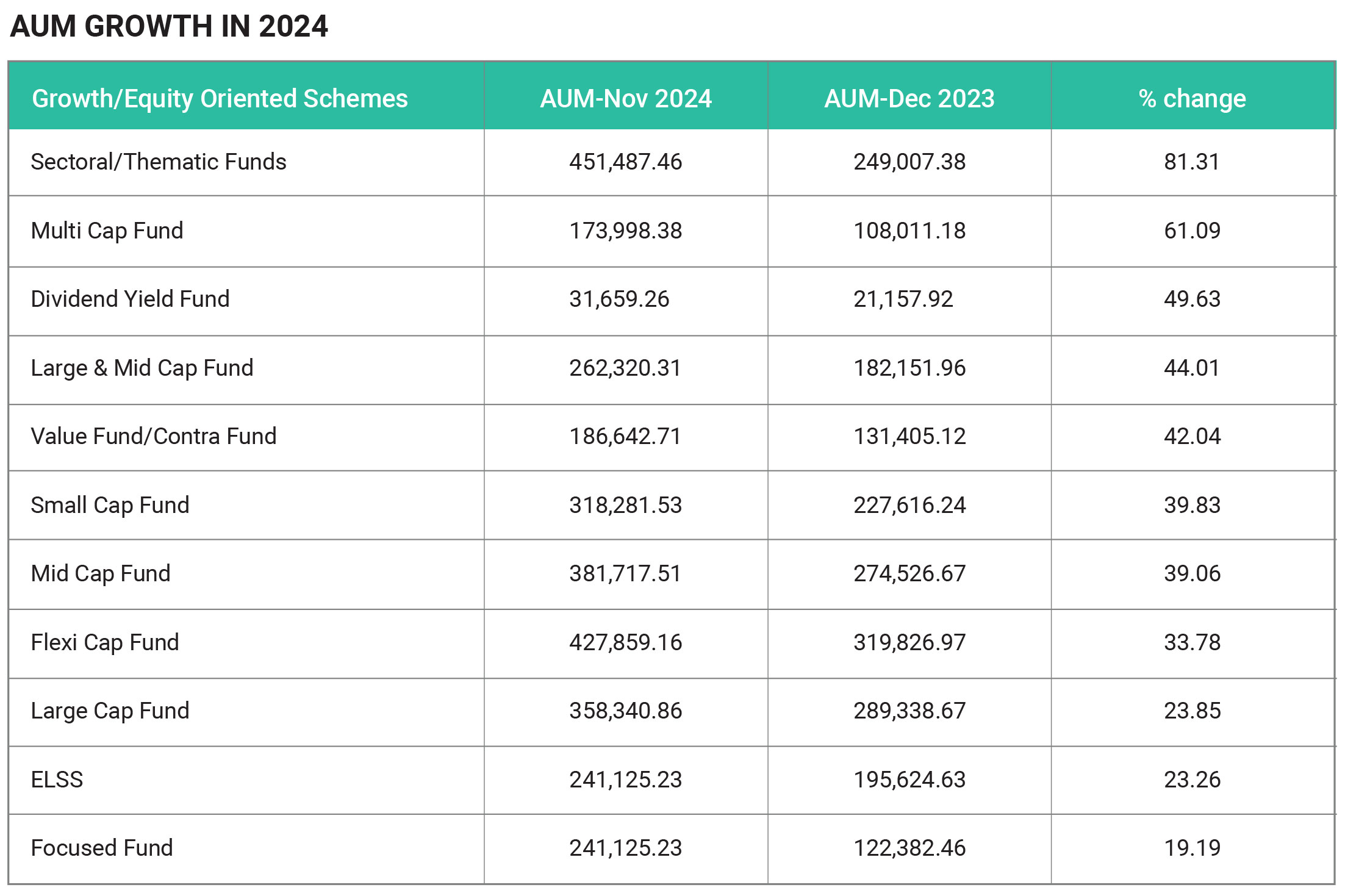 In December 2024, the Indian mutual fund industry saw impressive growth, driven by a sharp rise in assets under management (AUM) and strong inflows from retail investors. The AUM reached ₹69 lakh crore by the end of December 2024, reflecting a remarkable increase of 35.5% from ₹50.24 lakh crore in December 2023. A significant contributor to this growth was the surge in systematic investment plan (SIP) contributions, which hit ₹25,320 crore by November 2024, up 44% from ₹17,610 crore in December 2023. This trend indicates that retail investors are increasingly embracing disciplined and regular investing strategies. The total SIP AUM reached a record ₹13.54 lakh crore, showcasing the growing popularity of this investment approach across Indian households. Equity funds, especially mid-cap and small-cap schemes, outperformed other categories, benefitting from a favourable market environment. Both the Nifty Midcap 100 and Nifty Small cap 100 indices saw strong gains, enhancing the performance of equity mutual funds. Active equity schemes witnessed record inflows of around ₹3.5 trillion, more than doubling the previous year's figure of ₹1.6 trillion, with SIPs contributing nearly ₹2 trillion. The industry also added about 9.8 million new investors in the first eleven months of 2024, raising the total number of unique investors to around 51.8 million by November. Thematic funds, particularly those focused on sectors like technology and healthcare, attracted substantial inflows, benefiting from the ongoing economic recovery. On the other hand, debt funds saw a sharp decline in inflows, with November 2024 recording a 92% drop compared to the previous month. Despite this, 2024 witnessed a record number of fund launches, with 153 equity schemes introduced, further diversifying options for investors. to around 51.8 million by November. Thematic funds, particularly those focused on sectors like technology and healthcare, attracted substantial inflows, benefiting from the ongoing economic recovery. On the other hand, debt funds saw a sharp decline in inflows, with November 2024 recording a 92% drop compared to the previous month. Despite this, 2024 witnessed a record number of fund launches, with 153 equity schemes introduced, further diversifying options for investors.