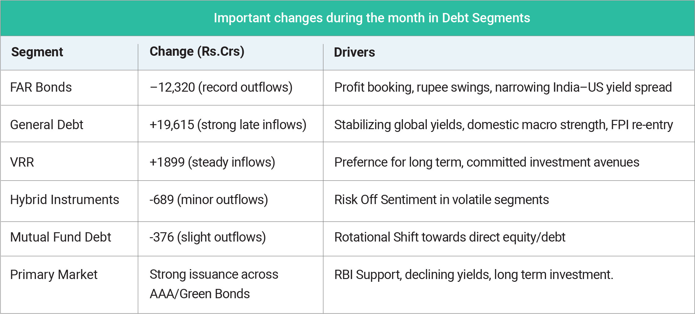 The Indian debt market in May 2025 reflected a nuanced interplay of domestic strength and global headwinds. While profit-taking and rupee volatility triggered heavy selling in index-linked (FAR) bonds, the broader market sentiment remained resilient, thanks to late-month FPI inflows into General Debt, RBI liquidity support, and softening yields. Demand for high-quality corporate and green bonds in the primary market further underscored investors’ confidence in India's long-term fundamentals. Going into June, debt market participants will be watching the RBI’s policy stance, currency stability, and global rate trends, which will be crucial in sustaining momentum across segments.