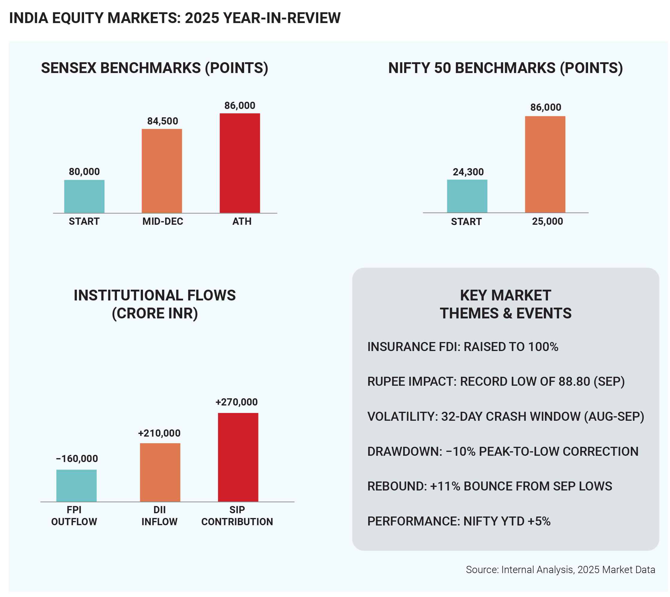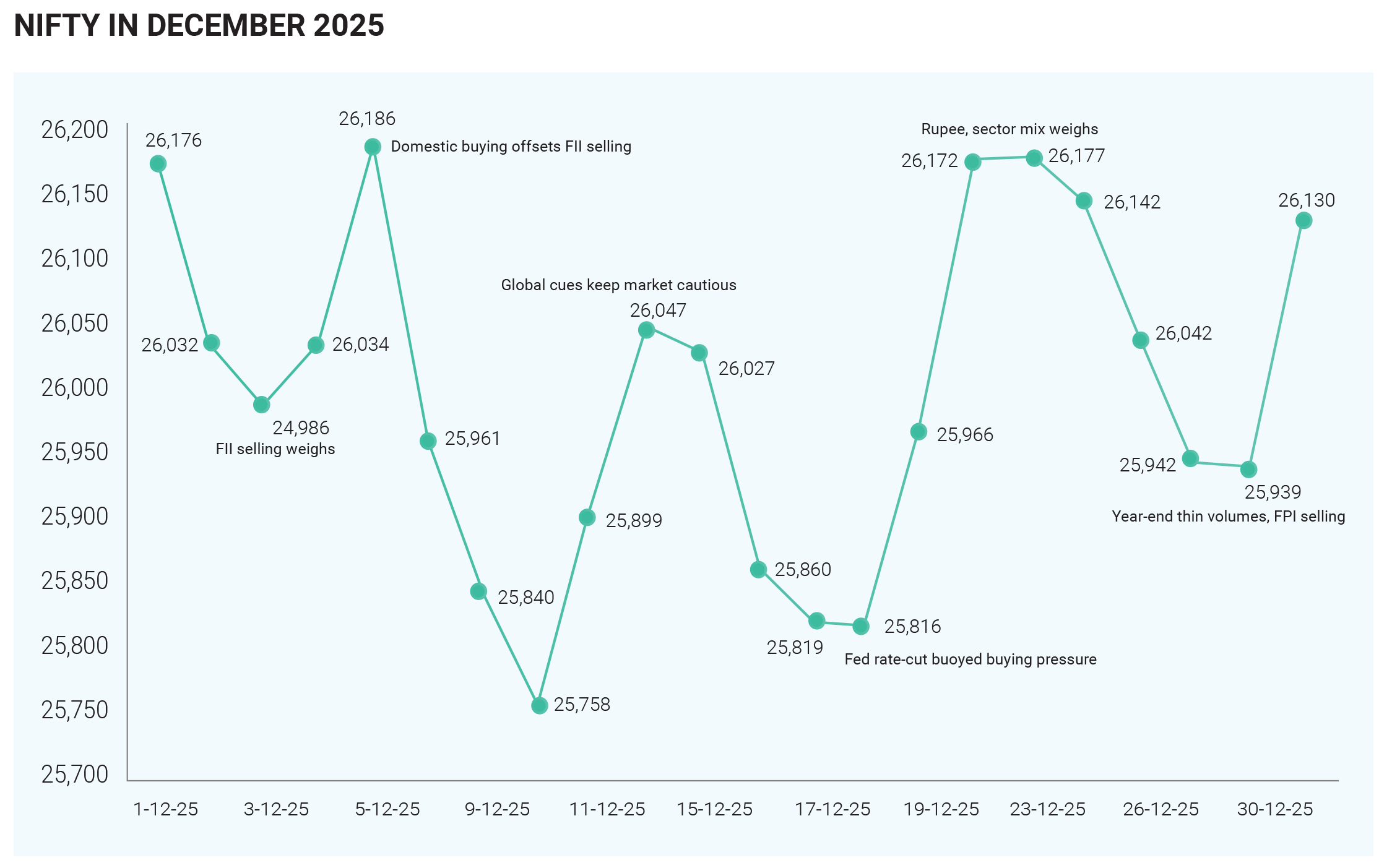 The divergence between foreign selling and domestic buying prevented deeper drawdowns, kept market breadth tilted toward liquid frontline stocks, and reinforced the perception that domestic capital had become the marginal price-setter. Sectoral performance was notably differentiated compared with November’s broad-based rally: IT stocks benefited from sustained global demand for digital and AI-linked services and from rupee weakness, which supported earnings translation and margins; healthcare and pharma held up well as defensive plays with stable demand visibility, particularly in domestic-focused names and hospital chains; energy stocks outperformed on value buying and policy support, with integrated and downstream players aided by lower crude prices and expectations of healthy refining margins; financials delivered mixed but generally supportive performance, with PSU banks and select rate-sensitive lenders gaining on expectations of strong credit growth and an accommodative policy path, while some private banks faced intermittent pressure due to concerns around net interest margin compression and pockets of asset-quality stress; consumer sectors saw profit-taking in FMCG after earlier resilience despite improving volume trends and easing inflation, while discretionary stocks were stock-specific, with autos supported by demand and rate-cut hopes but retail names consolidating after sharp prior rerating; utilities remained among the weaker segments, as concerns around tariffs, demand visibility and operational pressures capped enthusiasm, limiting buying to balance-sheet-strong names; and metals and industrials moved in a choppy but mildly positive fashion toward month-end, helped by import-related policy measures, domestic capex expectations and year-end positioning despite uneven global demand indicators. The macro backdrop during the month remained largely supportive domestically: Q2 FY25 GDP growth around 8% exceeded expectations, inflation stayed benign, and the RBI delivered a dovish policy signal by cutting the repo rate by 25 basis points to 5.25%, announcing ₹1 trillion in open market operations and a USD 5 billion buy/sell swap to inject liquidity, which helped soften bond yields and underpin sentiment. However, these positives were tempered by external pressures, including a firm US dollar, weak emerging-market currencies, geopolitical uncertainty, US trade policy risks, China’s deflationary signals, and falling crude prices, all of which reinforced caution among foreign investors. The rupee’s nearly 2% depreciation over the month weighed on foreign returns but also highlighted India’s relative resilience: instead of triggering disorderly selling, equities absorbed the shock through sideways movement as domestic flows cushioned the impact. By year-end, market positioning clearly favoured quality, earnings visibility and balance-sheet strength over high-beta momentum, with index valuations cooling modestly from peak optimism but remaining supported by earnings delivery and liquidity. Overall, December 2025 closed with Indian equities in a deliberate, balanced stance: headline indices near record highs but without exuberance, foreign investors cautious but not capitulating, domestic institutions firmly in support, and the market entering 2026 consolidated, selective and grounded in fundamentals rather than momentum.